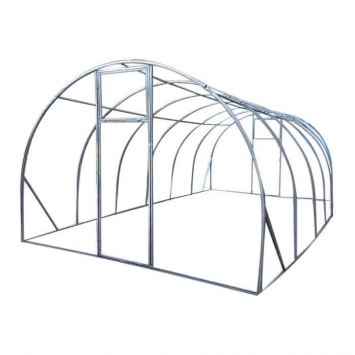 Это арочный каркас теплицы под названием "Дарина усилена", изготовленный из оцинкованной стальной трубы. Размеры трубы составляют 30 на 30 миллиметров с толщиной 1 миллиметр. Дверь и окно уже собраны из труб размером 20 на 20 миллиметров, а расстояние между арками составляет 1 метр. Пленка не входит в комплектацию.